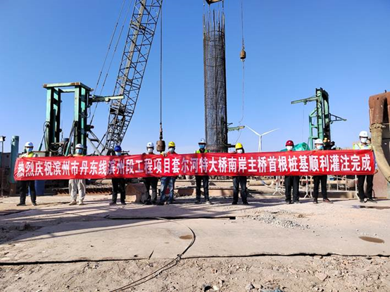 2022年5月21日,隨著最后一方混凝土灌入導管,濱州G228項目套爾河特大橋南岸主墩首根樁基順利灌注完成,標志著濱州G228項目套爾河特大橋南岸正式進入主體施工階段。