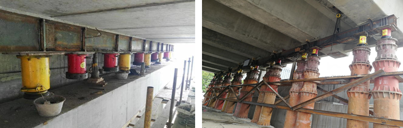 項目團隊采用橋梁整體同步調坡頂升技術,個液壓千斤頂配備一個位移傳感器,實時監測、控制橋梁頂升的位移和姿態,使同步頂升的精度精確到1毫米,萬噸重的橋梁“拔地而起”。
