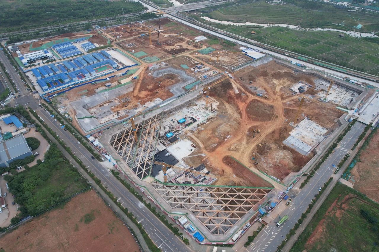 項目施工面臨“大、高、多”等困難,其中,地下室深基坑局部三層,接近總建筑面積的50%,高支模最高14.4米,且超危大工程高支模區域達28處。項目精心組織施工,科學安排生產,采取平行施工的方式,克服基坑階段場區道路狹窄等困難,完成約70萬m3土方開挖和模板支護、拆撐。