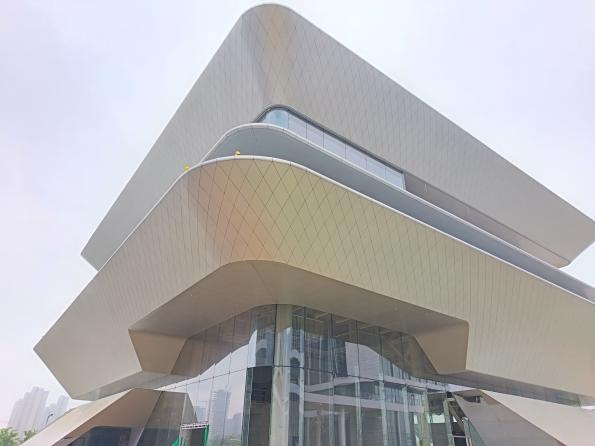 項目綜合樓外立面為“山峰”造型設計,包含豎明橫隱玻璃幕墻、全玻幕墻、開縫鋁板幕墻、玻璃欄板4種幕墻系統,采用5系進口陽極氧化鋁板,涂層厚度超15μm,具有極強耐腐蝕性,鋁板超20年不褪色;外立面菱形蜂窩板塊合計10228塊,四個轉角為雙曲蜂窩板,雙曲作業面超30%,以直線型、出挑、倒圓角等設計手法,塑造動感、理性、簡約的建筑造型。