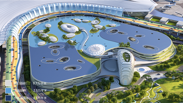 屋面由2.5萬平水池屋面及3.5萬平光伏板構(gòu)成,水池采取不同鋪裝形式,營造出水波紋漣漪的效果,形成“自給自足”的綠色人文景觀,對應(yīng)理念中“湖——半城湖水”的生動展現(xiàn)。