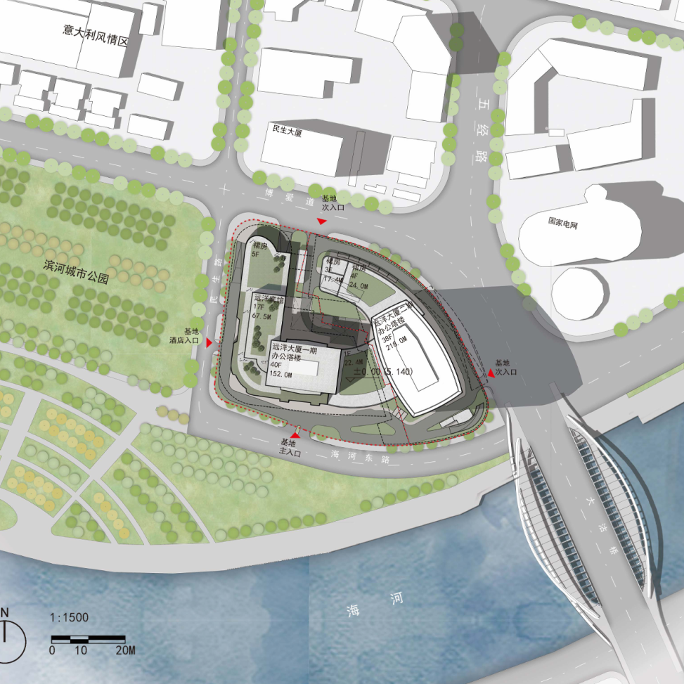 項目地處天津市區核心位置,南臨海河,東臨大沽橋毗鄰天津站,地理位置優越,總建筑面積約10.79萬平方米,建設高度218米,分為地下5層,地上38層,項目建成后將成為全市港產城融合發展的重要載體,海河沿線重要的地標建筑,為推動天津市港產城融合發展賦能聚力。