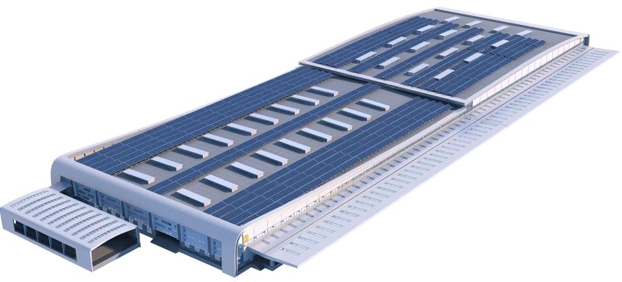 項目建設4棟單體廠房,最大單層面積1.9萬平方米,共設有21個5噸月臺升降機,滿足教輔教材等貨物儲存、分揀需求,廠房屋面安裝大面積光伏系統(tǒng)可實現(xiàn)部分園區(qū)設施、周邊交通運輸及公共設施“零碳”供電。