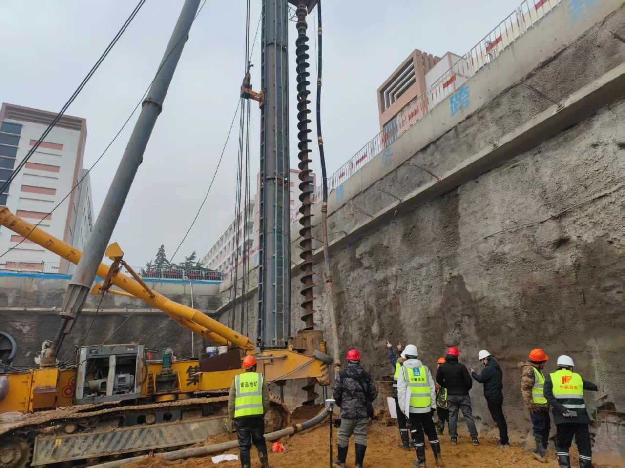 項(xiàng)目地下水情況復(fù)雜,工程樁成樁困難,項(xiàng)目組織專家論證及現(xiàn)場(chǎng)水頭壓力試驗(yàn),創(chuàng)新性應(yīng)用嵌巖型長(zhǎng)螺旋鉆孔灌注工藝,改良機(jī)械與降排水方式,優(yōu)化混凝土配合比,有效降低承壓水對(duì)施工的影響。