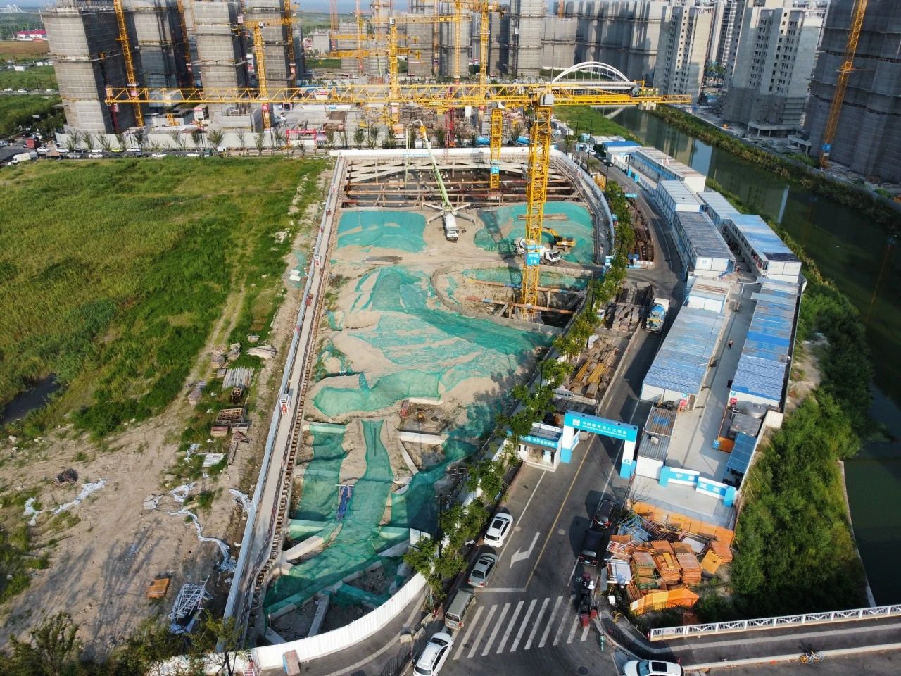 項(xiàng)目應(yīng)用“先撐后拆”施工方法,通過“開挖一段土方、施工一段基礎(chǔ)拆除一段圍護(hù)”的方式,在狹小空間里“靈活作戰(zhàn)”應(yīng)用“鉆孔灌注樁+高壓旋噴樁”減小機(jī)械占用空間,以抬高正負(fù)零標(biāo)高0.5米的方式,使基坑與周邊場地持平,避免雨季內(nèi)澇隱患,保障項(xiàng)目如期封頂。