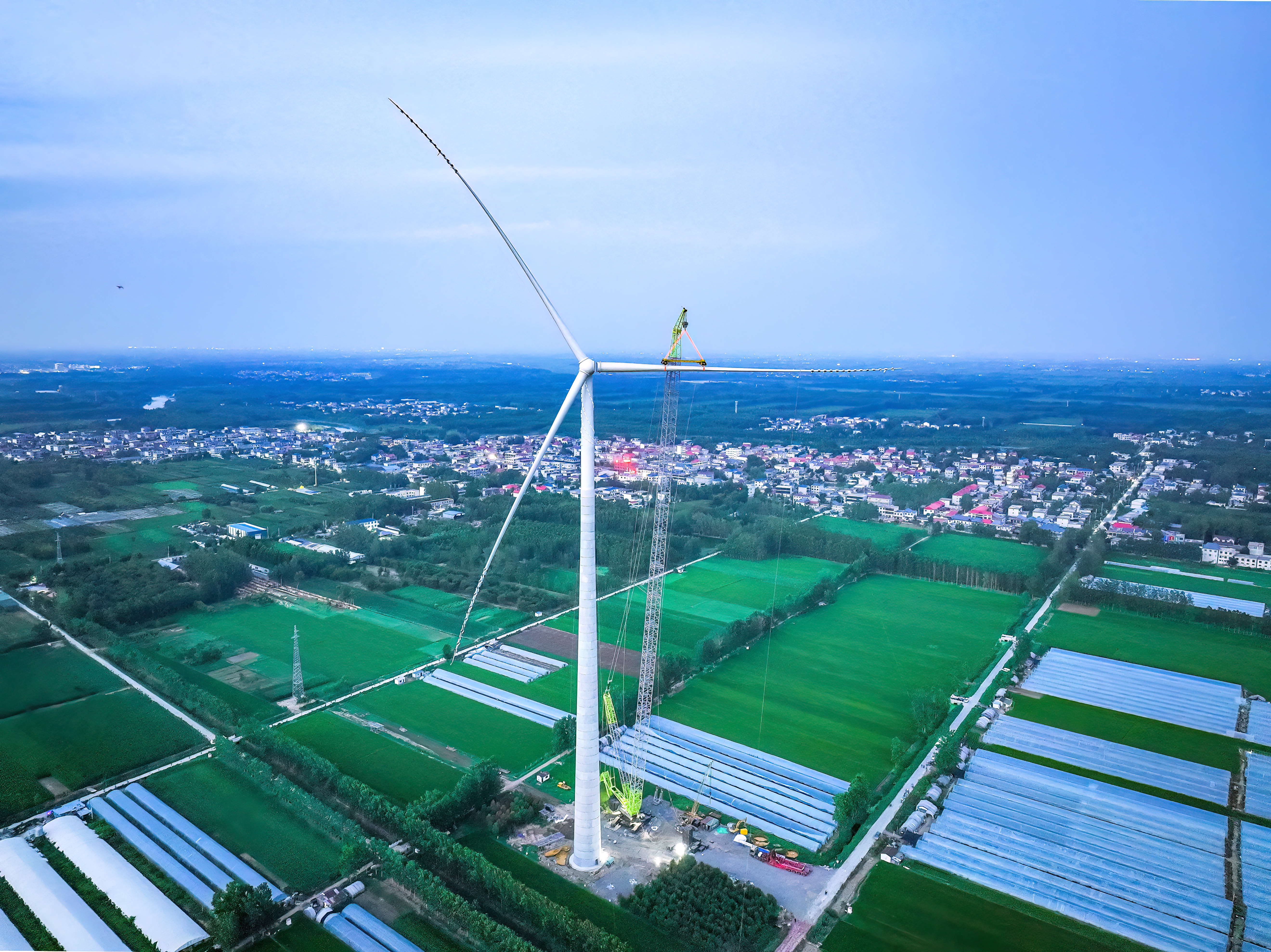 此次吊裝的風機高185米,采用“主吊+副主吊”吊裝方式,實現46節混塔與2節鋼塔高強螺栓連接,127噸機艙、直徑220米葉輪升空固定。項目團隊高度重視前期策劃,提前32天完成7個鄉鎮、20個行政村協調工作,采用“一機一案”的施工方式,克服大件運輸、大型設備吊裝危大工程管控等難點。“吊裝小組”使用智能化風速儀、無人機、360°攝像頭等實時監測,護航吊裝全過程,順利完成首臺風機百米吊裝。