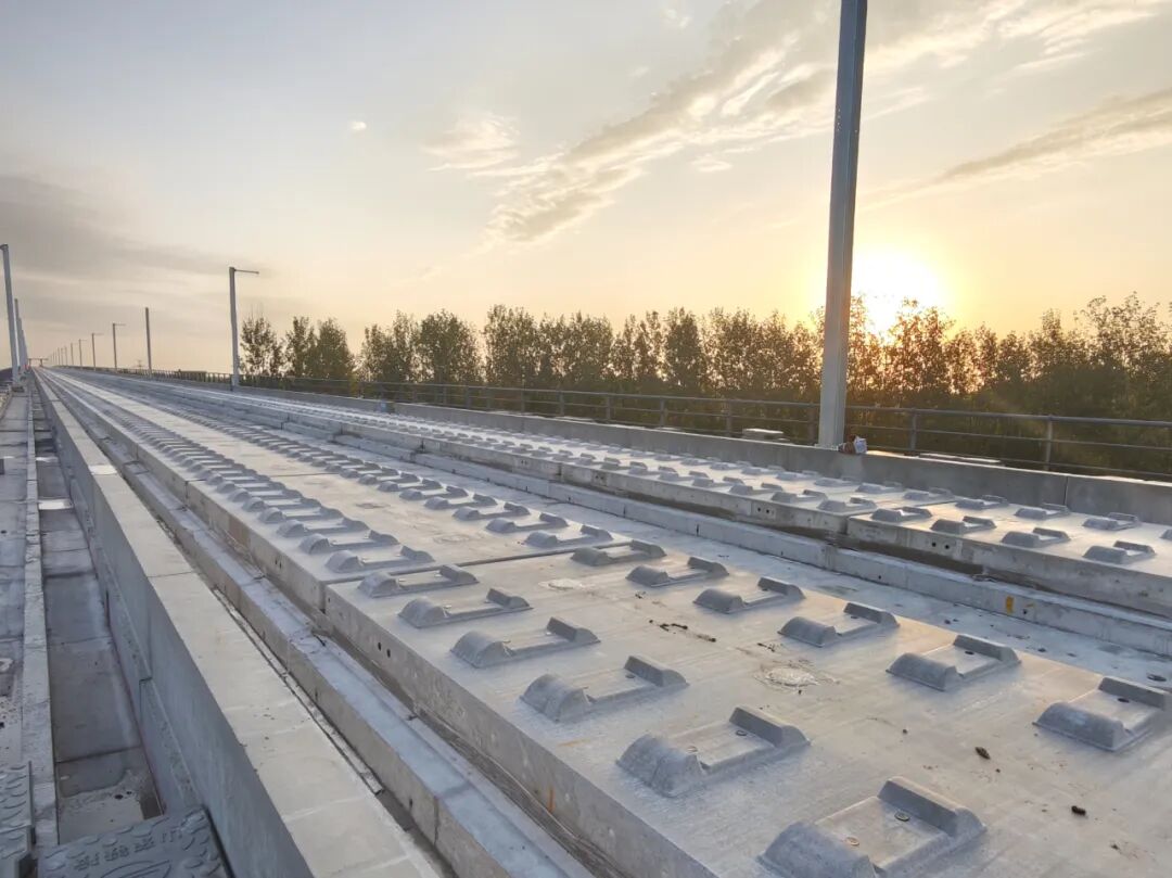 跨徒駭河 144 米系桿拱是濟濱高鐵全線控制性工程,該橋梁總長 148 米、主跨徑達 144 米,橋面軌道板安裝精度直接影響線路整體運行安全。為保障結構穩定,項目團隊創新采用預壓工藝模擬橋梁荷載,同步精準測量梁體變形數據,配合無懸臂門式起重機吊裝作業,成功實現大跨度橋梁軌道的精確安裝。