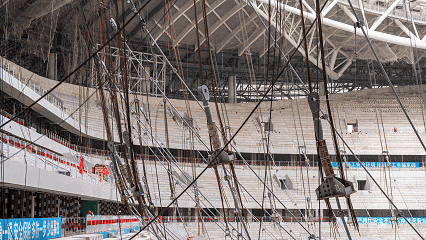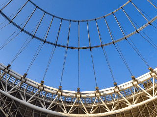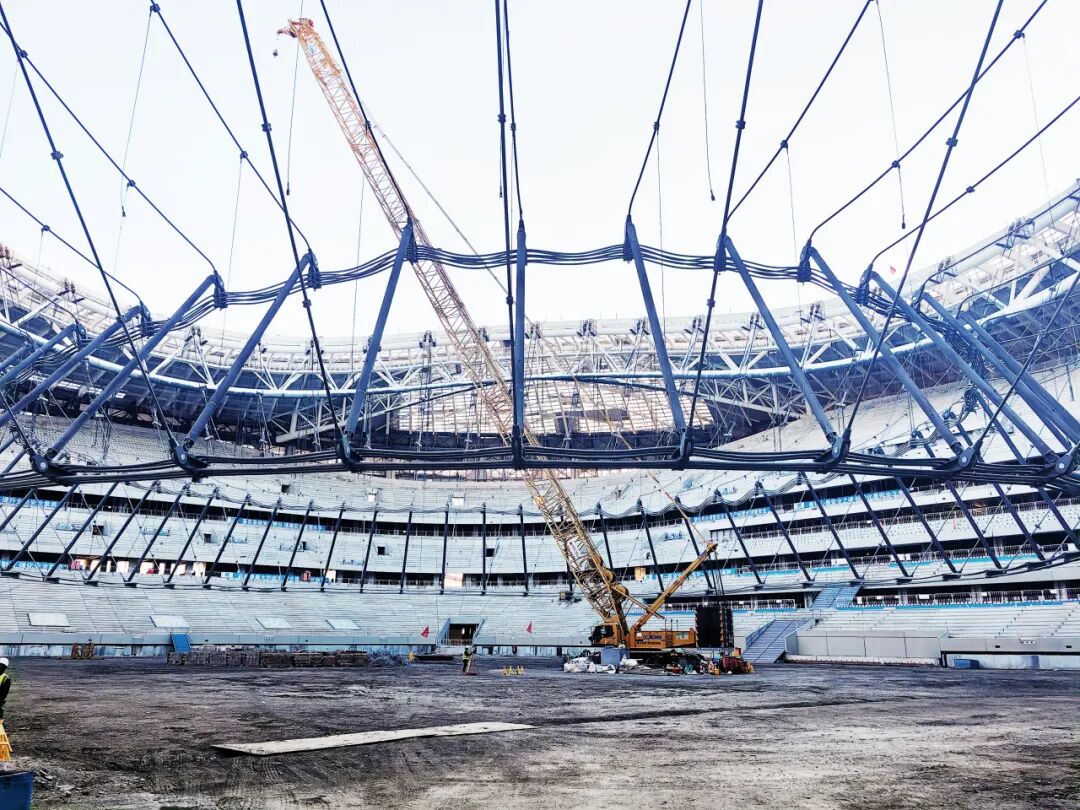 該足球場屋蓋采用國內首個平面單層膜輪輻式索膜結構體系,這張形似 “巨型自行車輪” 的索桁架是索膜結構體系的支撐骨架,未來將張拉高透光 PTFE 膜,為觀眾提供通透、舒適的觀賽環境。