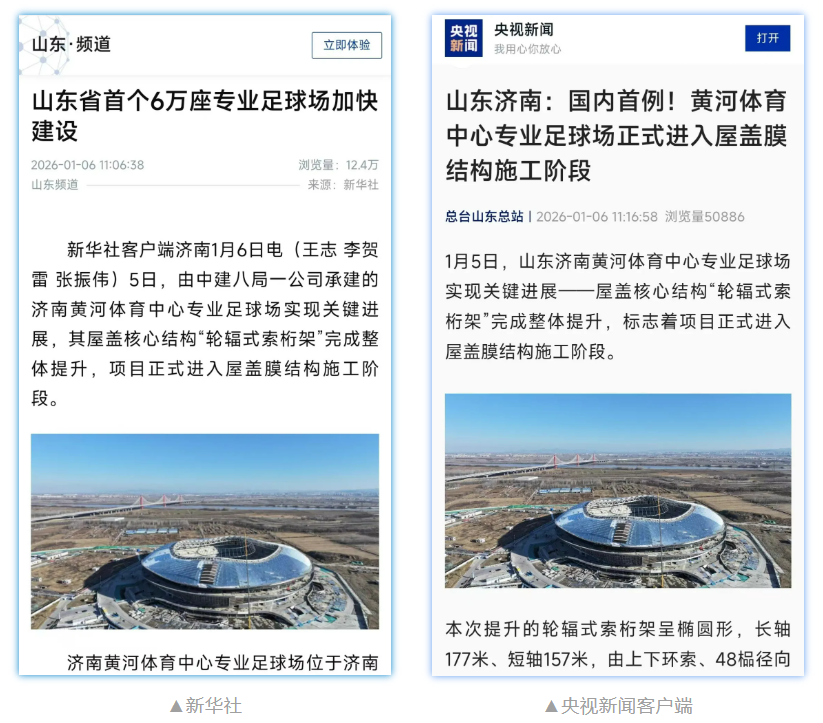 日,中建八局一公司承建的山東省首個 6 萬座專業足球場——黃河體育中心專業足球場項目完成輪輻式索桁架體系吊裝,正式進入屋蓋膜結構施工階段,受到新華社、央視新聞等主流媒體報道。