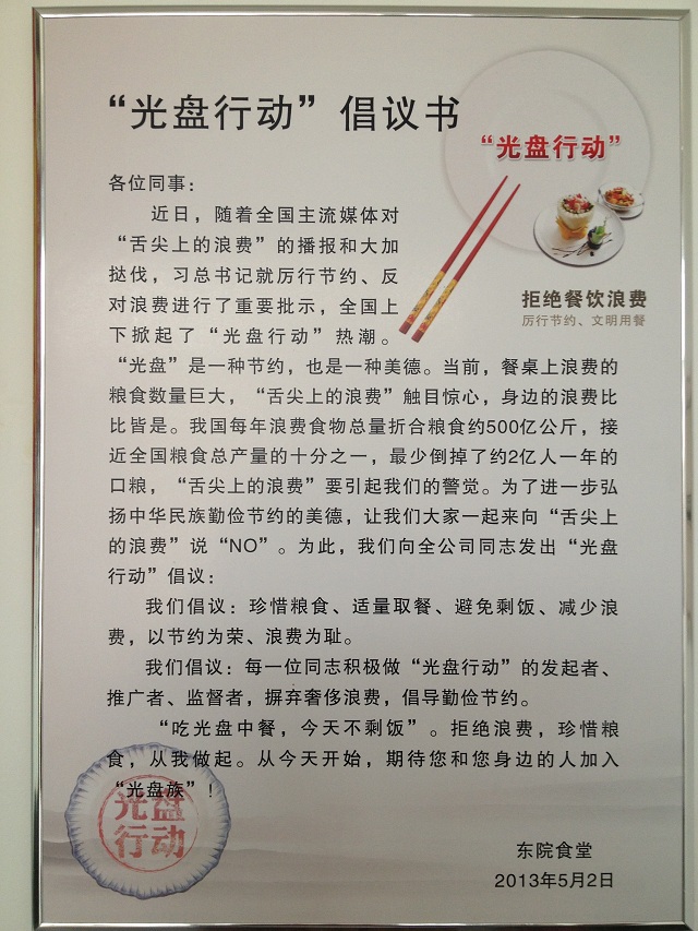 “加入‘光盤行動’,節約從我做起”,“拒絕舌尖上的浪費,從這里做起!”,近日,一公司濟南分公司職工食堂的墻面上一份倡議書,一幅幅的宣傳標語,吸引了不少前來就餐職工的眼球。