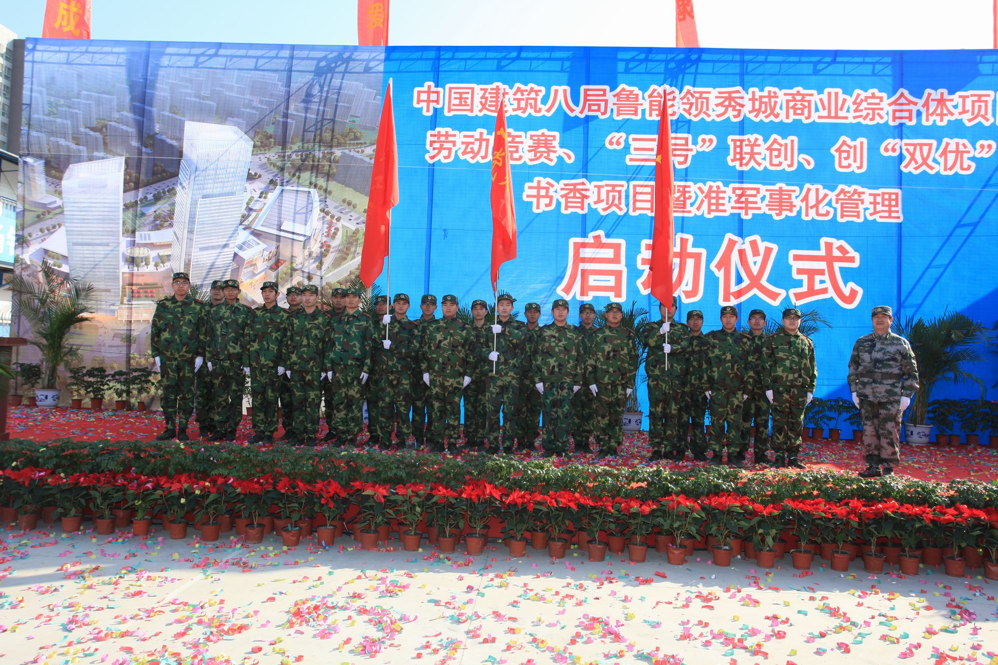 12月7日上午10點30分,魯能領秀城商業綜合體工程項目隆重舉行勞動競賽和黨員先鋒號、工人先鋒號、青年文明號“三號聯創”以及“工程優質、干部優秀”的創雙優活動、創建書香項目、準軍事化管理試點活動啟動儀式,共青團山東省委副書記袁良、濟南市總工會常務副主席朱守華、濟南市消防支隊政委張財坤、市中區人民檢察院黨組副書記、副檢察長翟衛星、魯能集團有限公司副總經理高毅、局黨委副書記、工會主席于金偉、局總經理助理、山東分局黨委書記王克復、一公司黨委書記許紅等領導應邀參加了活動。