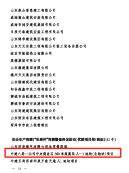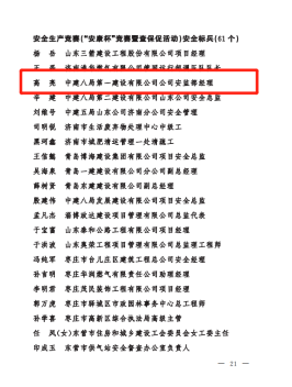 正值建黨百年之際,公司在山東省住建系統重點工作攻堅勞動競賽先進典型選樹活動中斬獲多項榮譽,包括山東省住建系統改革創新攻堅競賽示范企業(一公司)、山東省住建系統重點工程攻堅勞動競賽示范企業(一公司)、山東省住建系統重點工程攻堅勞動競賽示范項目部(魯南高鐵、農業工程學院淄博校區)、山東省住建系統安全生產競賽(“安康杯”競賽暨查保促活動)優勝單位(一公司)、山東省住建系統安全生產競賽(“安康杯”競賽暨查保促活動)優勝項目部(平安360)、山東省住建系統勞模和工匠人才創新工作室(趙忠楊超高層高效建造創新工作室)等6項集體榮譽和山東省住建系統改革創新標兵(1人)、山東省住建系統重點工程攻堅勞動競賽標兵(2人)、山東省住建系統安全生產競賽(“安康杯”競賽暨查保促活動)安全標兵(1人)等3項個人榮譽。